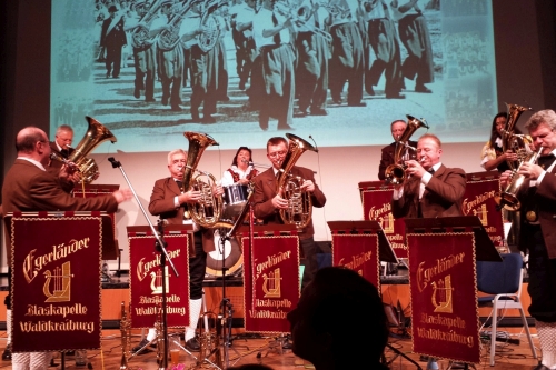 2. Bürgermeister Richard Fischer mit Frau Ursula, OV Vorsitzender Bernd Wegmann, Stadträtin Christine Blaschek, Kreisrat Alex Will mit Frau Anni und Christa Zabelt im Haus der Kultur zu einem vergnüglichen Nachmittag mit Blasmusik. Selbst Landtagsabgeordneter Günther Knoblauch schaute auf eine Stunde vorbei. Viele Waldkraiburger Familien haben ihre Wurzeln im Egerland, die bekannten Melodien und Lieder erinnern viele an ihre Kindheit. Abgesehen davon, dass hier Musikanten mit Herzblut auf der Bühne stehen, diente der Nachmittag außerdem als Benefizveranstaltung. Der Gesamte Erlös kommt der Evangelischen Kirche zur Kirchturmrenovierung zu Gute.