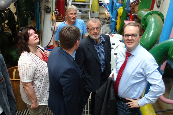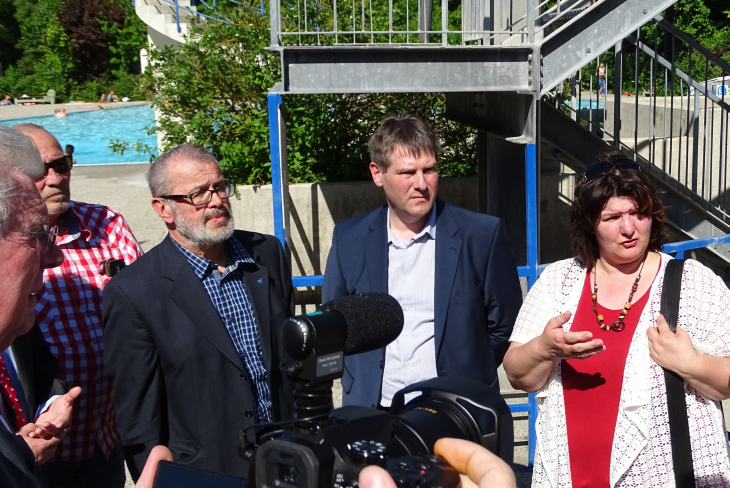 Mitglied des Landesvorstandes der SPD Annette Heidrich auch den Landtagsabgeordneten Günther Knoblauch auch Herrn Lechner von den Stadtwerken und Herrn Spierling, Bademeister im Waldbad zu einer Führung durch das Bad begrüßen. Der Istzustand des Bades
