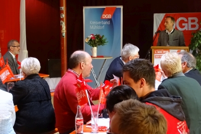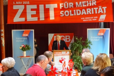 Bürgermeister Robert Pötzsch und stellvertretender Landrat Alfred Lantenhammer sprachen Grußworte und bekräftigten nochmals die Wichtigkeit aktiver Gewerkschaften. Danach kam der Hauptredner des Abends, MdL Bernhard Roos von der IG Metall zu Wort. Auch er bezeichnete den Mindestlohn als große Errungenschaft, der den pessimistischen Zukunftsprognosen von der Vernichtung von Arbeitsplätzen in keiner Weise entsprach.