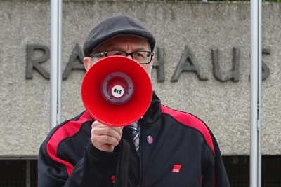 In der Schenkerhalle begrüßte DGB Kreisvorsitzender Richard Fischer die anwesenden Gäste und Mitglieder,