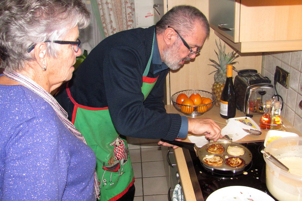 Gegen 16°° war es dann soweit, der Kaffee gekocht, das Geschirr gedeckt und der Teig „aufgegangen“. Mit geschickten Handgriffen zeigte Christa Zabelt „Pfanne heiß, Fett rein, Teig dazu, schon lösen, wenden, Rückseite lösen und raus zum Pudern mit Zucker. Alles beobachtete Richard Fischer sehr interessiert und noch entspannt. Das änderte sich schnell als er ran musste. Da kamen dann einseitig gebackene Liwanzen zum Puderzuckern oder beim Wenden bekamen die Liwanzen die Form von Kaiserschmarn. „Da muss man echt fix und hoch konzentriert sein“ so Fischer.