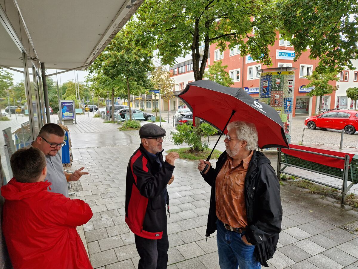 Kurzzeitig musste man wegen des einsetzenden Regens die Debatten unter das Vordach verlagern.