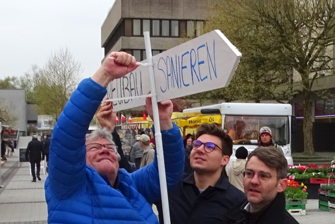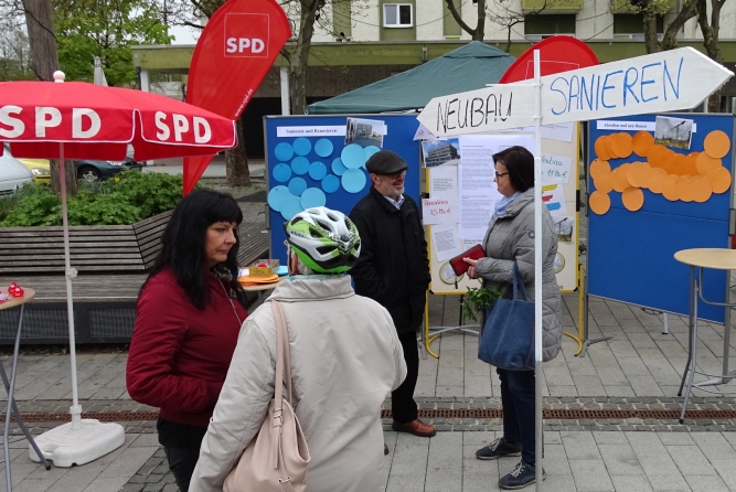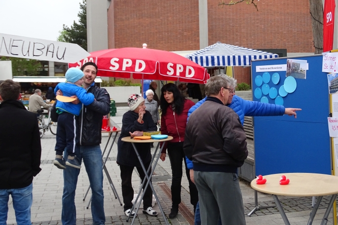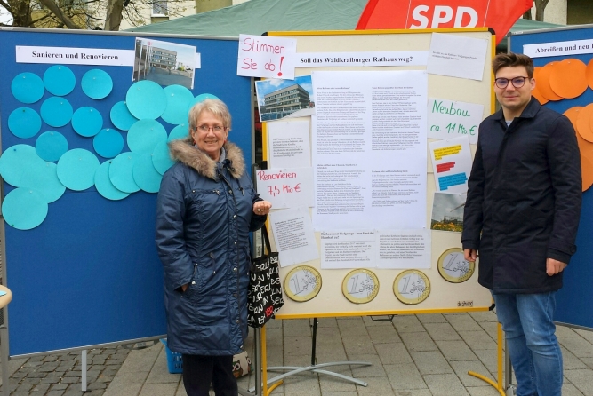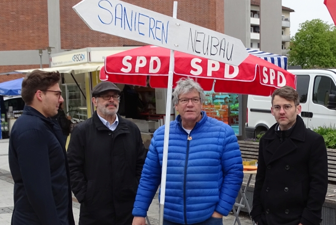 Mit dieser provokanten Frage startete der SPD Ortsverein seine Umfrage in der Fußgängerzone zum Thema Rathaus – Sanieren oder Neubau?