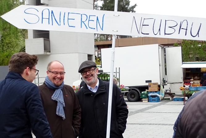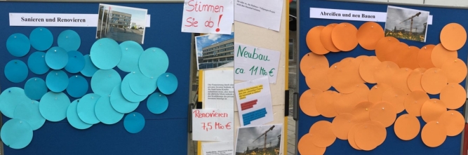 Mit verschieden farbigen Punkte konnte man für eine Sanierung stimmen (blau) oder aber für einen Neubau an anderer Stelle (orange). Das Interesse war sehr groß und manche Meinung wurde mit Nachdruck vertreten. Viele nutzten die Informationen an der Pinnwand, um sich vorher nochmals genau zu informieren. Als Mittag der Infostand geschlossen wurde, konnte man ein eindeutiges, nicht repräsentatives Ergebnis feststellen. 29 Bürger stimmten für eine Sanierung, 49 standen einem Neubau positiv gegenüber.