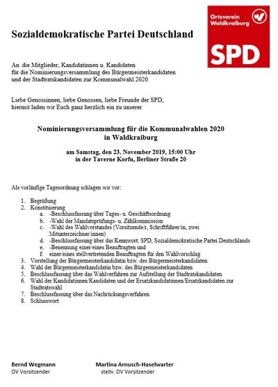 Anbei die Einladung zur Nominierungsversammlung. Samstag, 23. Nov. 2019 um 15 Uhr, im Korfu.