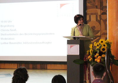 Christa Naaß begrüßte zahlreiche Gäste bei der Fachtagung des Bezirks zum Thema „Inklusion im Bezirk Mittelfranken“ im Berufsbildungswerk Nürnberg. „Wir haben uns“, so die stellvertretende Bezirkstagspräsidentin „für die Fachtagung ganz bewusst die Frage gestellt: „Sind wir auf dem richtigen Weg“?. „Wir, das sind wir alle, die in irgendeiner Weise mit dem Thema Inklusion zu tun haben: der Bezirk, die Kommunen, Gleichstellungsstellen, Behindertenbeauftragte, Sozialverbände, Behindertenvertretungen, Schulen und natürlich die Politik, die alle zusammen die Aufgabe haben, für die Umsetzung der UN-Behindertenrechtskonvention zu sorgen“.