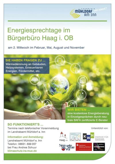 An dieser Stelle möchten wir Sie auf die kostenfreie Energieberatung durch zertifizierte Energieberater im Bürgerbüro Haag aufmerksam machen.