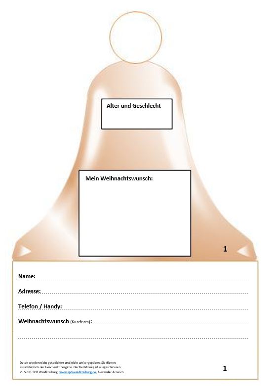 Es können Weihnachtswünsche bis zu 30€ an den Baum gehängt werden, pro Person nur ein Wunsch. Schreiben Sie Ihren Wunsch auf eine Karte und werfen Sie den unteren Teil in eine Weihnachtsbox, die bereit steht. Die Namen und Adressen werden nicht bekannt gegeben. Nur die Verteiler in unserem Ortsverein erfahren, wohin die Päckchen gehen.